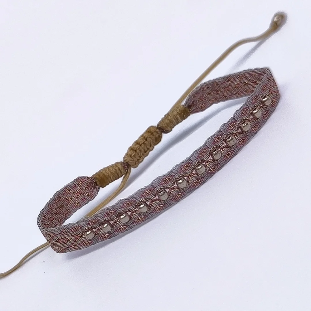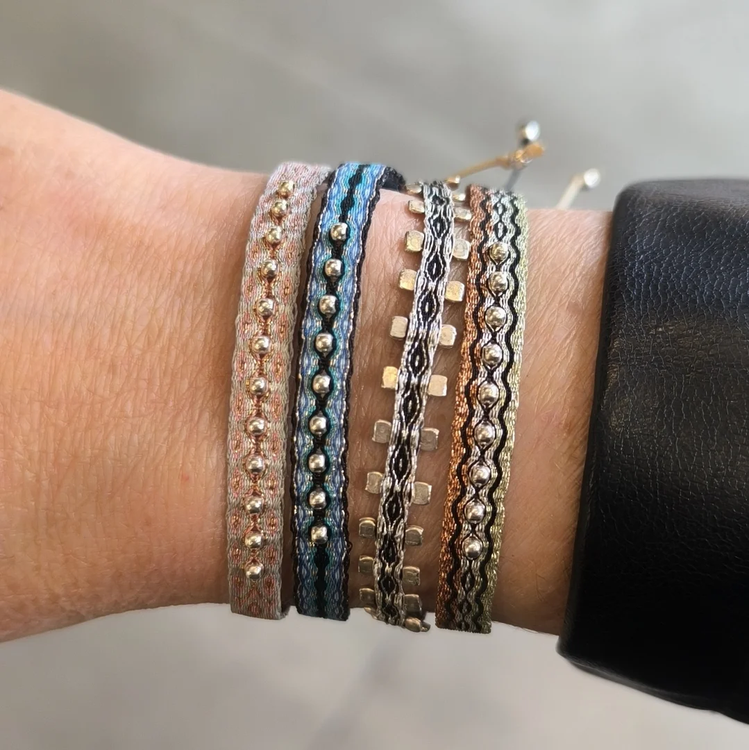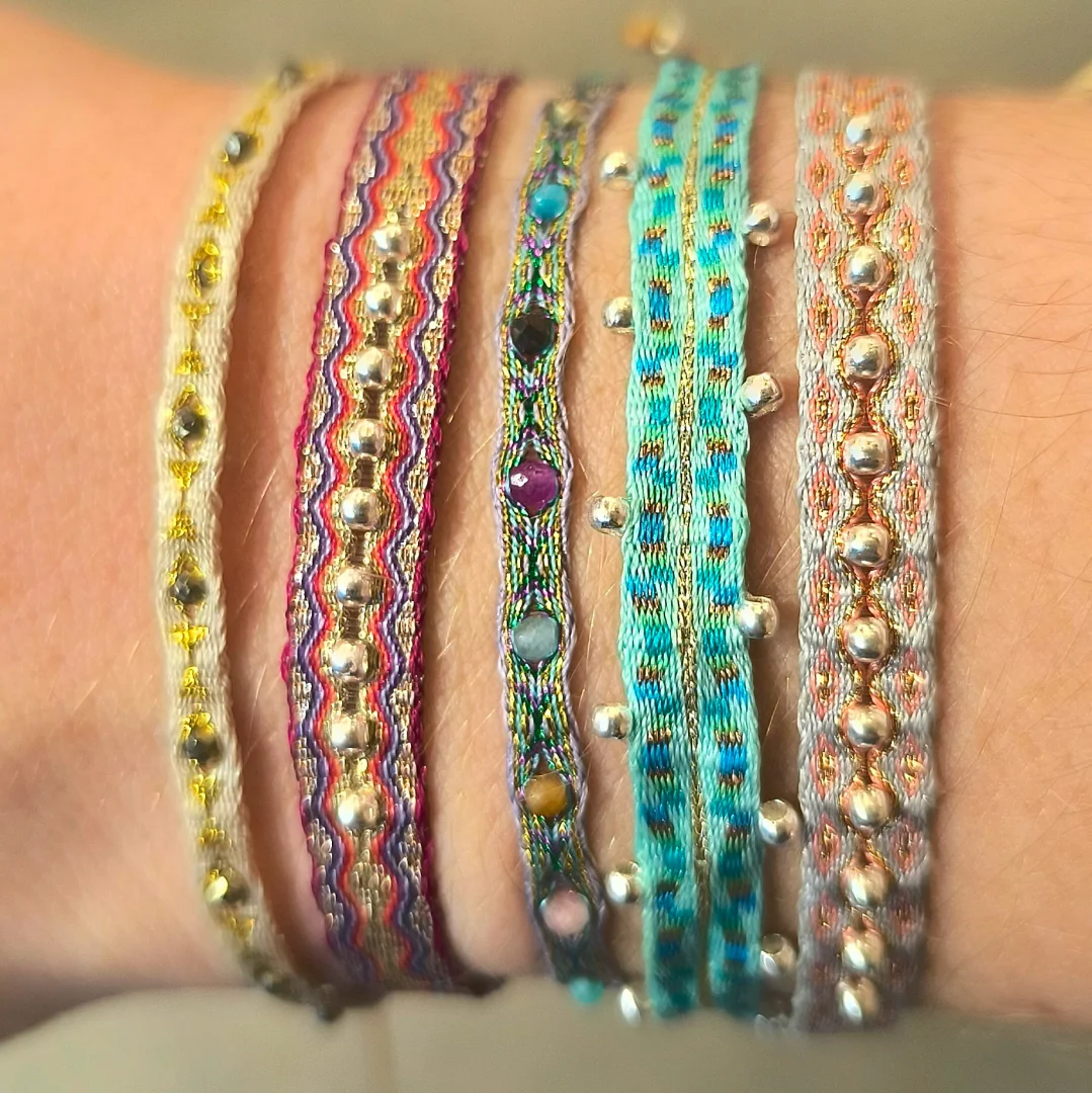 Pulseras hechas a mano en Colombia, tejidas en telar tradicional con hilos de seda. Son piezas ligeras, prácticas y resistentes, perfectas para el día a día.